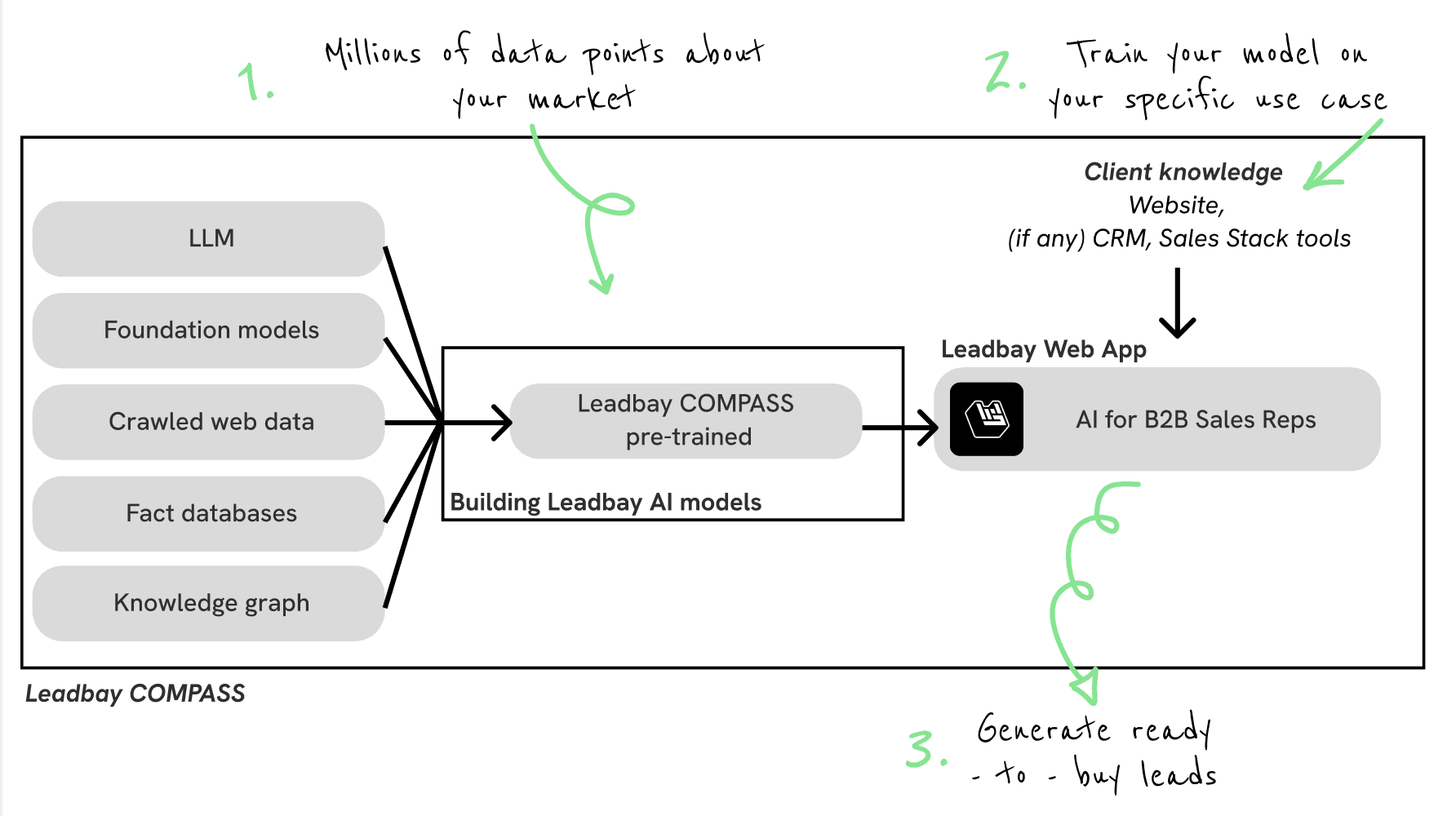 This article introduces Leadbay COMPASS, our first AI model for B2B sales reps. The first capabilities pertain to lead generation, lead scoring, and ideal customer profile refinement. The leadbay research team consists of Milan Stankovic, Phd - leveraging information-poor data for AI (60+ publications), a little tech team and a small group for B2B sales leaders from Google, Microsoft, Contentsquare, and Scaleway. Read our manifesto here.